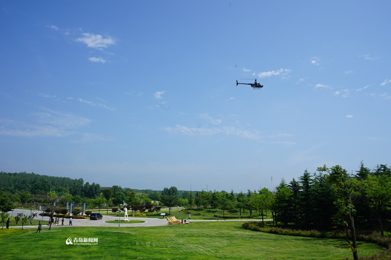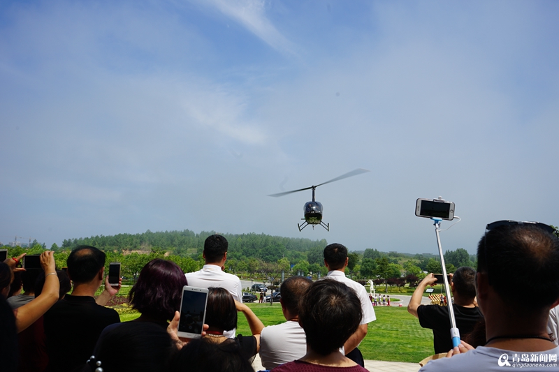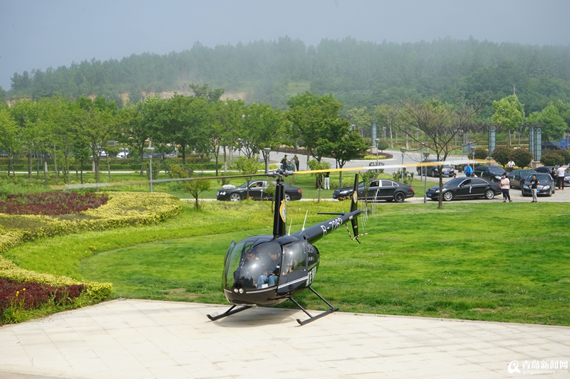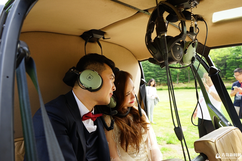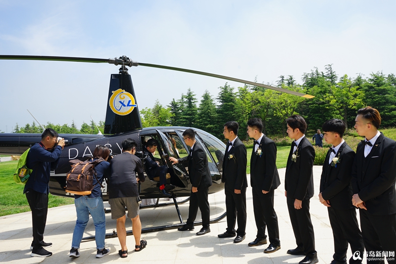 上午,新娘正在家里梳妝打扮,一架藏藍(lán)色的直升機(jī)從遠(yuǎn)處飛來,穩(wěn)穩(wěn)地降落在小區(qū)附近的足球場(chǎng)上。簡(jiǎn)短的儀式后,一對(duì)新人共同乘坐直升機(jī),飛機(jī)飛過田橫鎮(zhèn),沿著最美的即墨海岸線,繞過國(guó)際博覽中心,直達(dá)港中旅海泉灣度假酒店前坪。